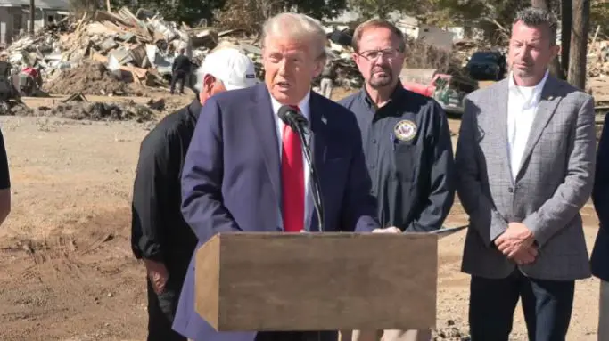President Donald Trump visited Asheville, North Carolina on Monday morning to survey the harrowing damage caused by Hurricane Helene, offering remarks to the media amid a backdrop of decimated houses and piles of rubble.
